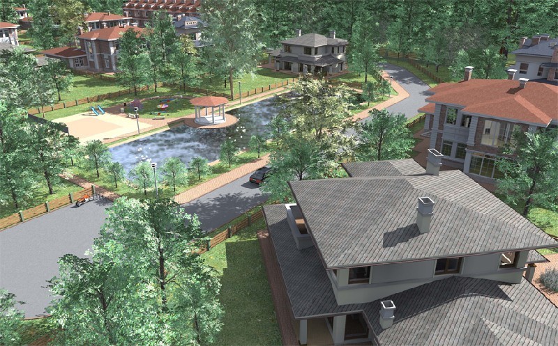 Через участок застройки не проходят сквозные дороги, значит приезжать сюда будут только местные жители. Поселок расположен недалеко от леса, рядом самый большой в этой местности водоем — каскадное озеро.