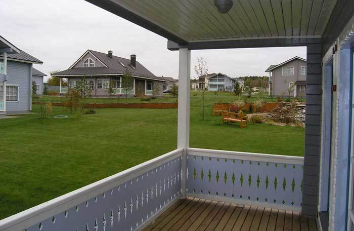 Благодаря продуманной концепции и удачному ее воплощению, поселок идеально вписался в окружающую природу — уникальные авторские коттеджи выполнены по финской технологии из клееного бруса. Выдержаны они в современном европейском стиле — огромные окна, просторные террасы, отделанный натуральным камнем цоколь.